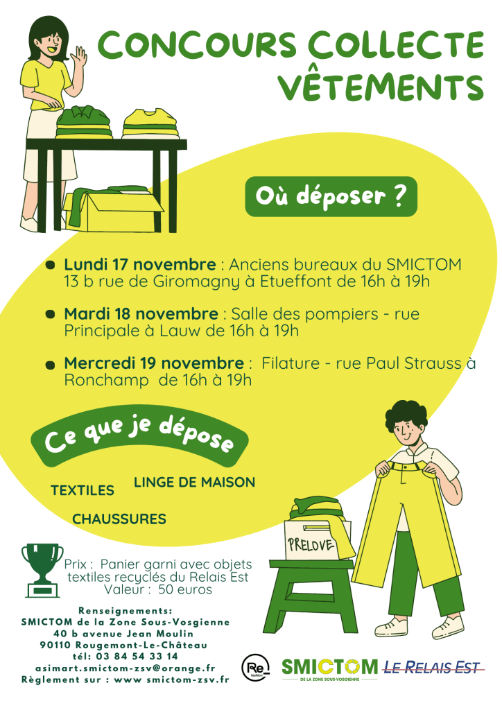 Textiles, linges de maison, chaussures et petite maroquinerie usagés encombrent nos poubelles alors qu’ils peuvent être recyclés. Les armoires débordent souvent de vêtements que l’on ne porte plus. En moyenne, chaque français produit 7kg de déchets textiles par an. Pour sensibiliser les habitants à la nécessité de trier les textiles, le SMICTOM de la Zone Sous-Vosgienne, en partenariat Le Relais EST, organise un concours de collecte.